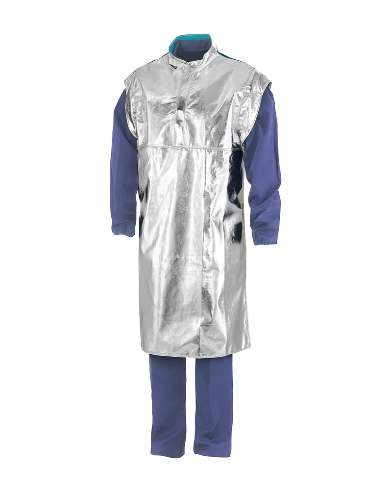 V5TCKAF is the aluminized aramid apron with sleeves of the line AluSoft. Stand-up collar and central closure cm 25 with velcro and press-studs. FR cotton back for air flowing.