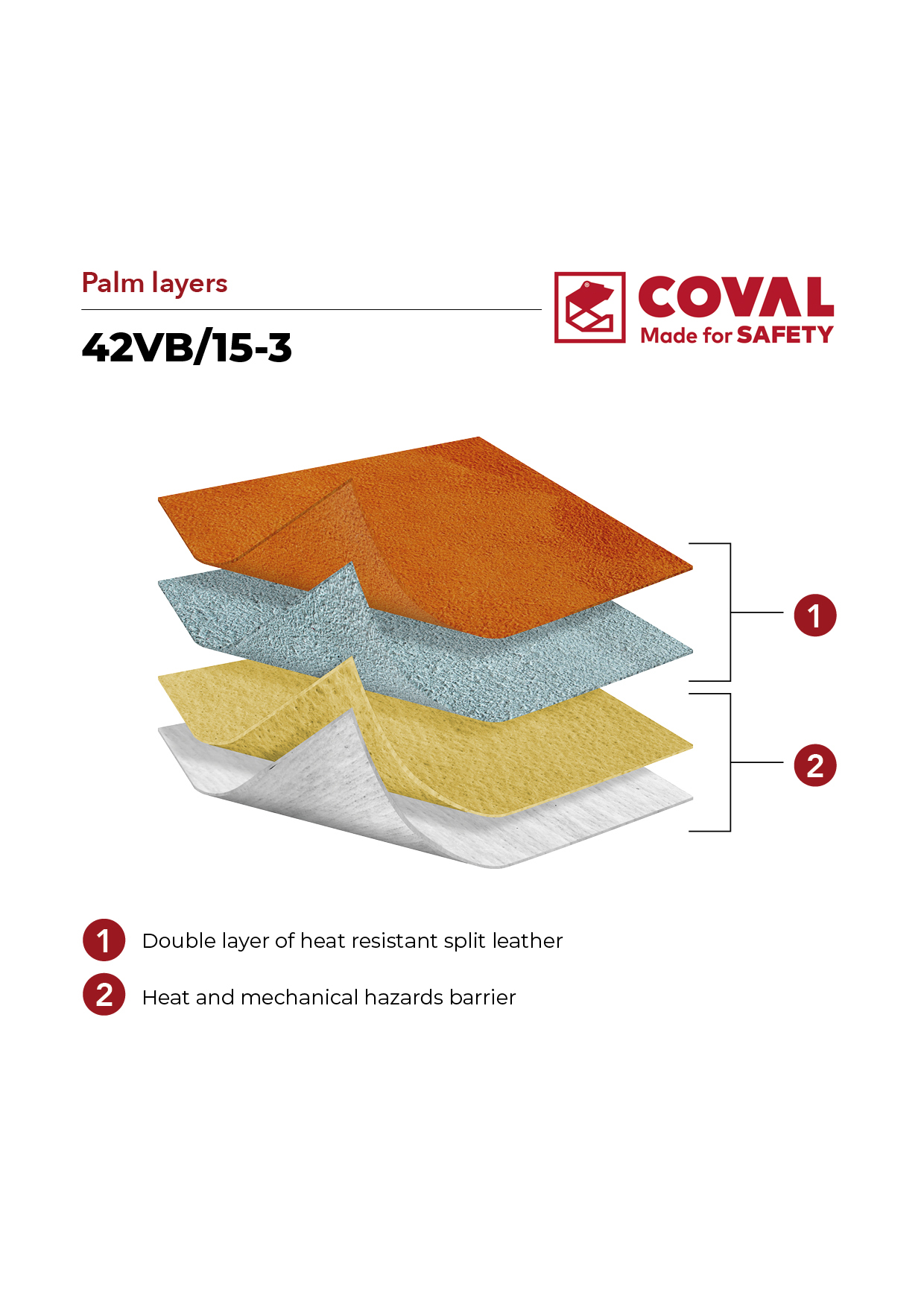 Heat resistant split leather glove with internal split leather reinforcement on palm and fingers.
