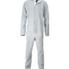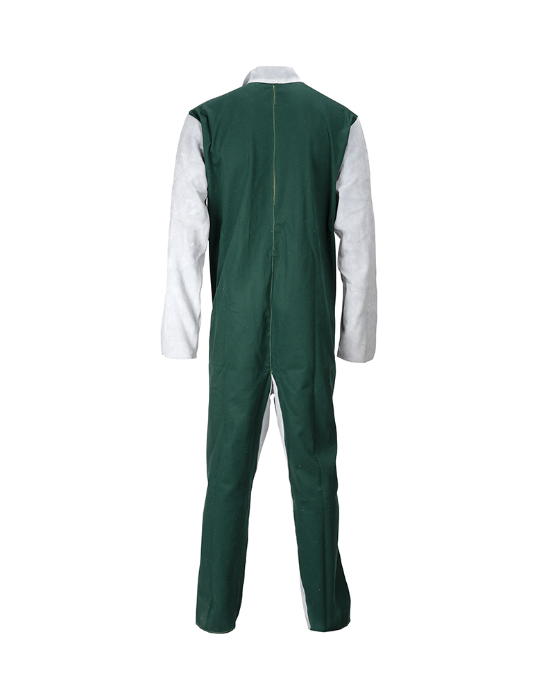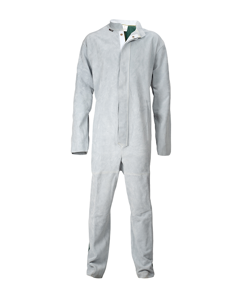 Combinaison en croûte de cuir avec dos en coton ignifugé. Fermeture centrale avec velcro et boutons à pression, col officier. Assemblage en fil kevlar.