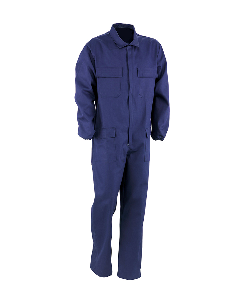Combinaison de soudage en coton ignifugé; col chemise et fermeture centrale avec fermeture à glissière et boutons-pression. Poignets élastiqués et taille élastiquée.