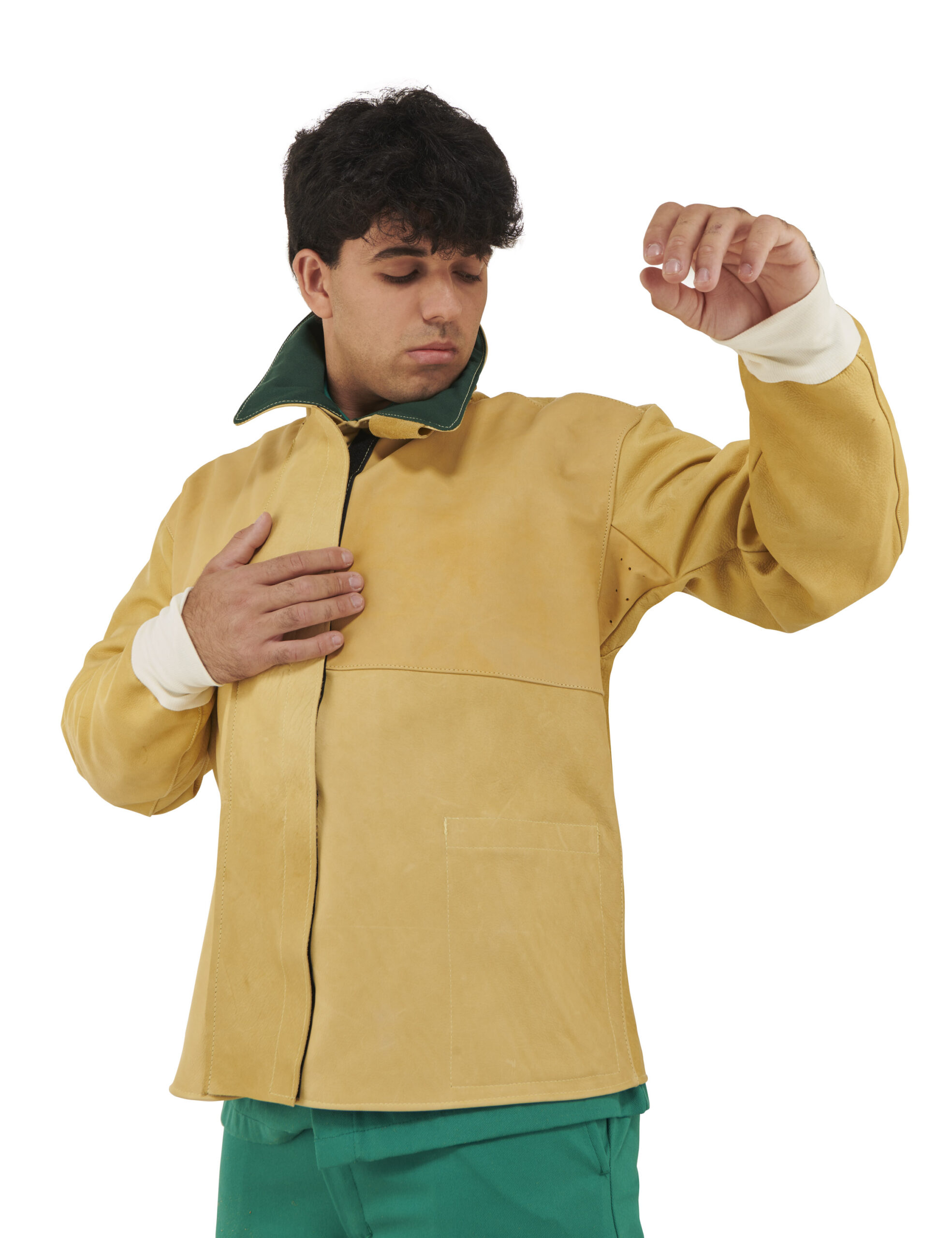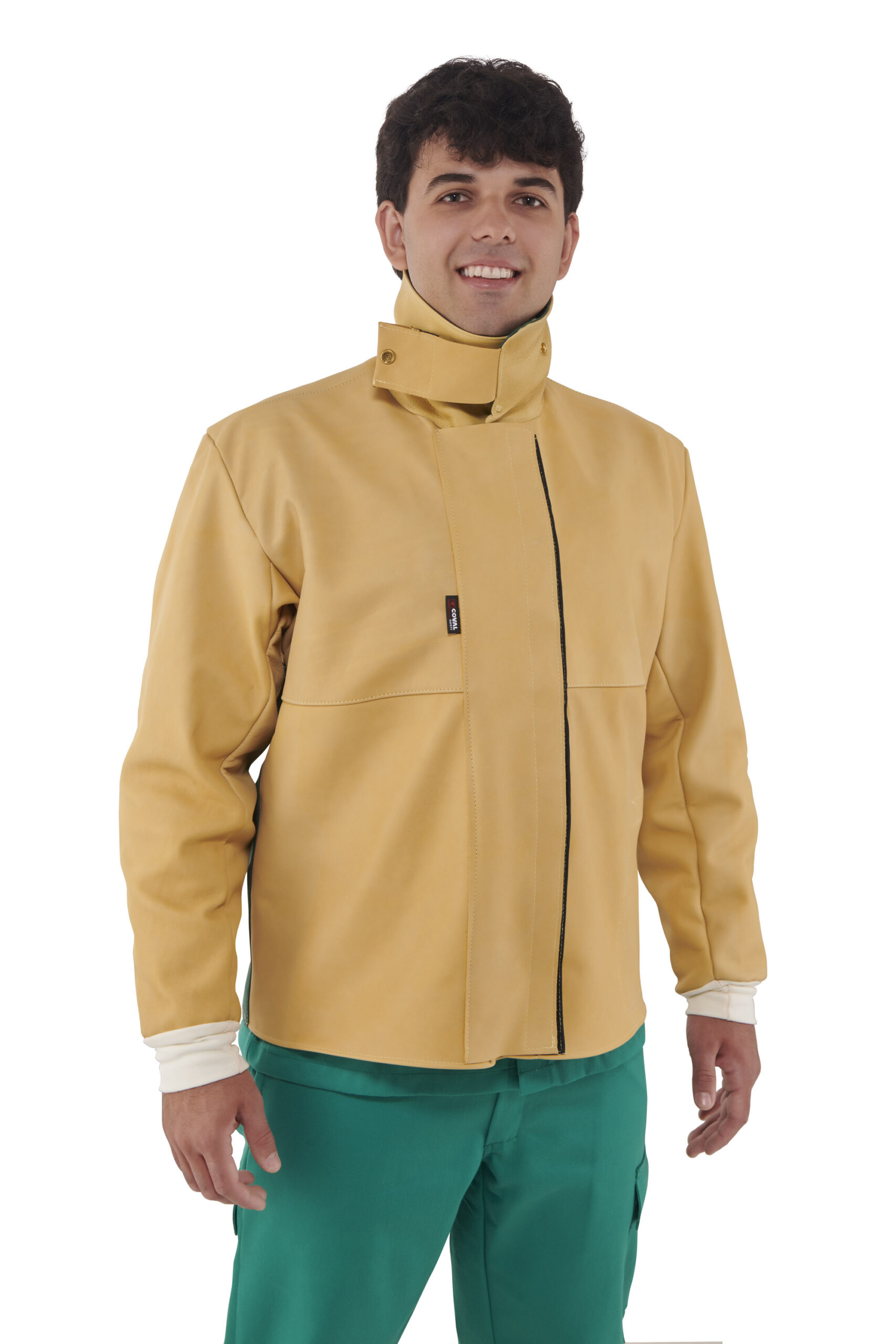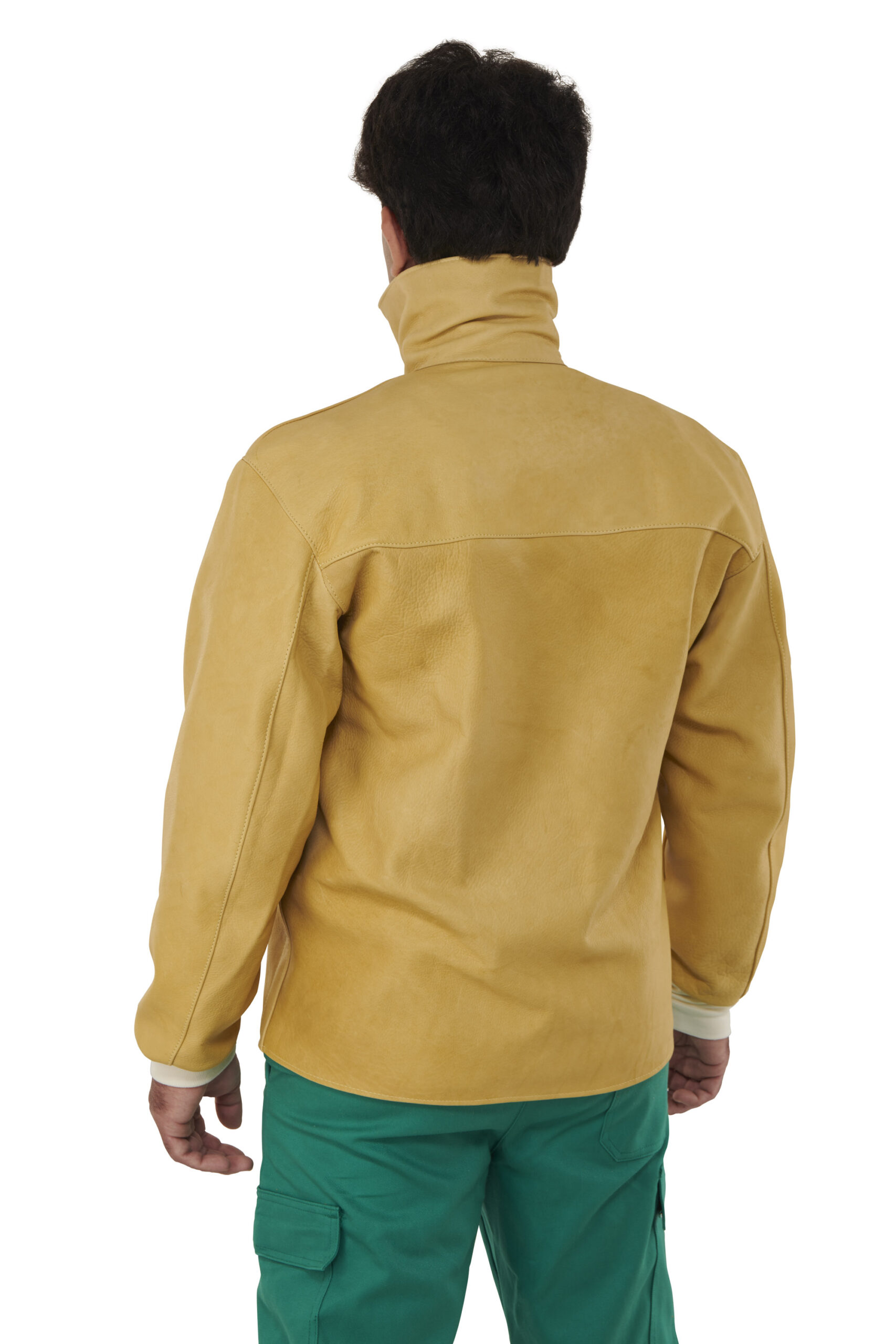 Fabriquée en cuir pleine fleur de haute qualité, de couleur jaune moutarde, elle offre résistance, souplesse et une protection durable contre les étincelles, la chaleur et les projections de métal en fusion.